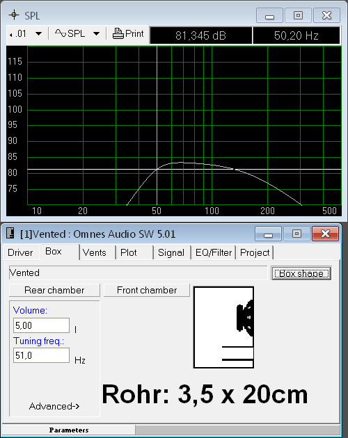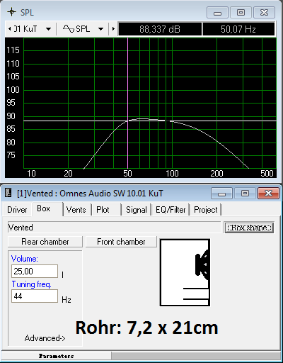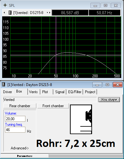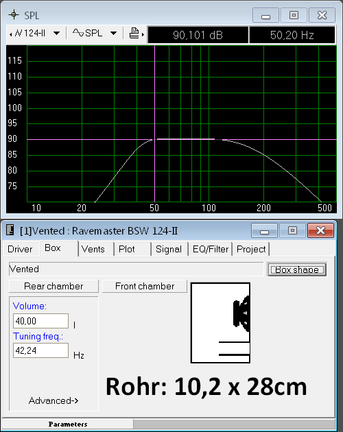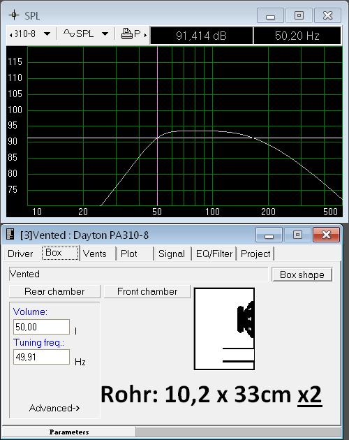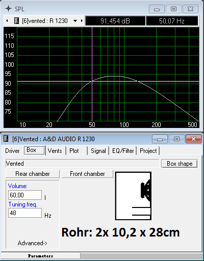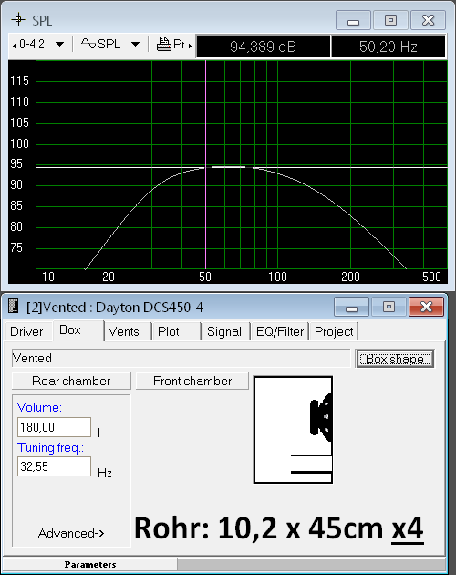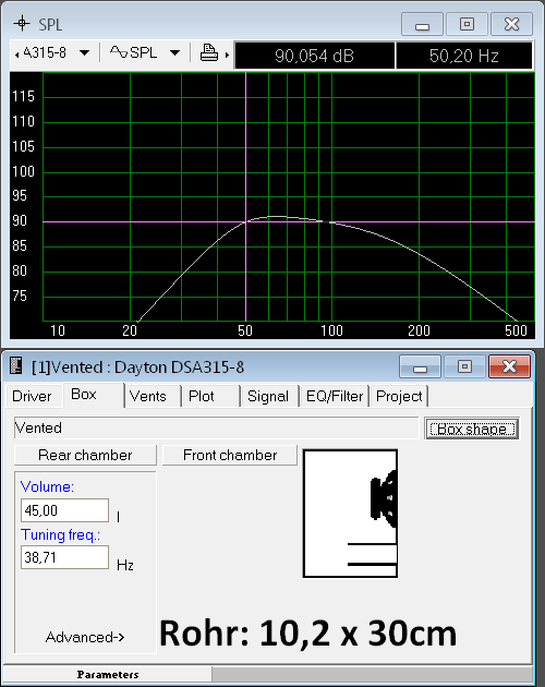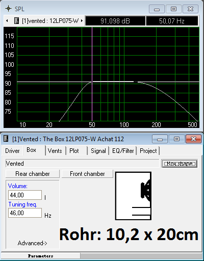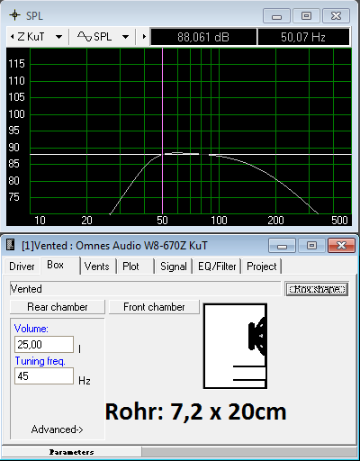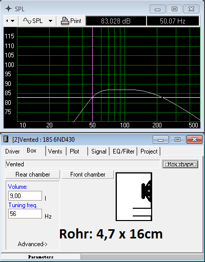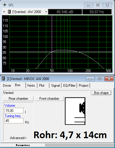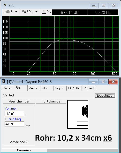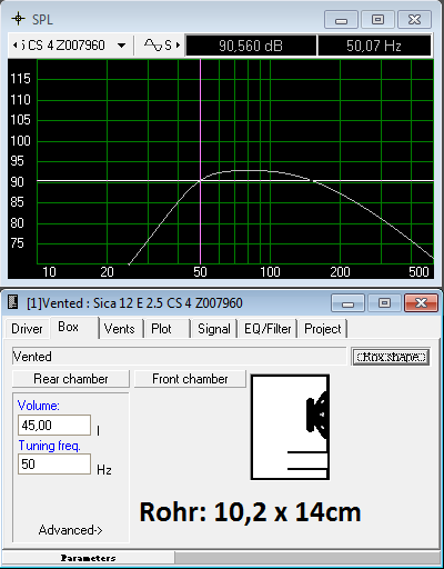 45L @ 50Hz | 1x 10,2 x 14 cm | 90,6 / 92,9 dB | 46Hz | 4Ω | €€ | Oder 2x Rohr 10,2 x 36cm |
