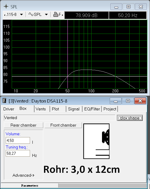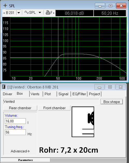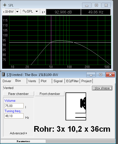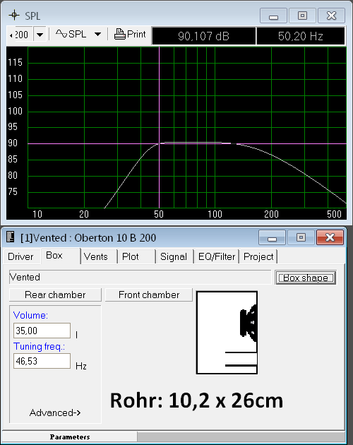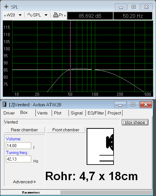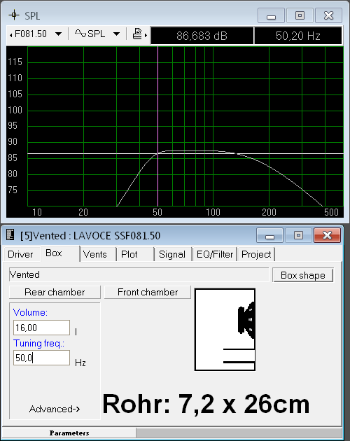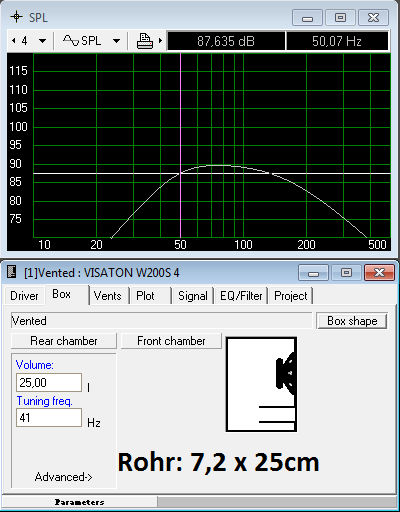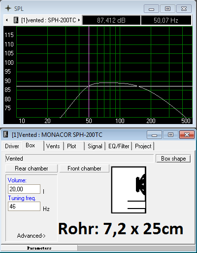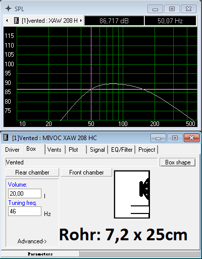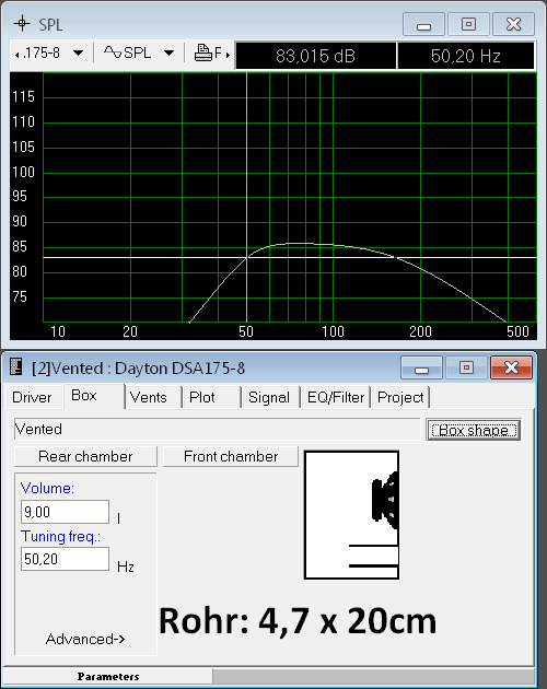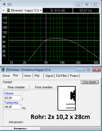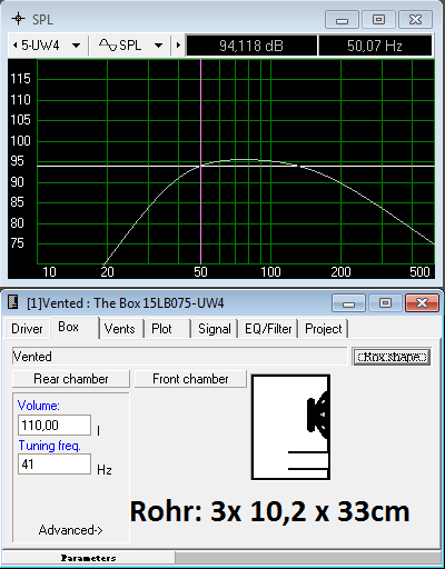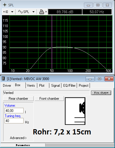 45L @ 50Hz | 1x 10,2 x 14 cm | 90,6 / 92,9 dB | 46Hz | 4Ω | €€ | Oder 2x Rohr 10,2 x 36cm |