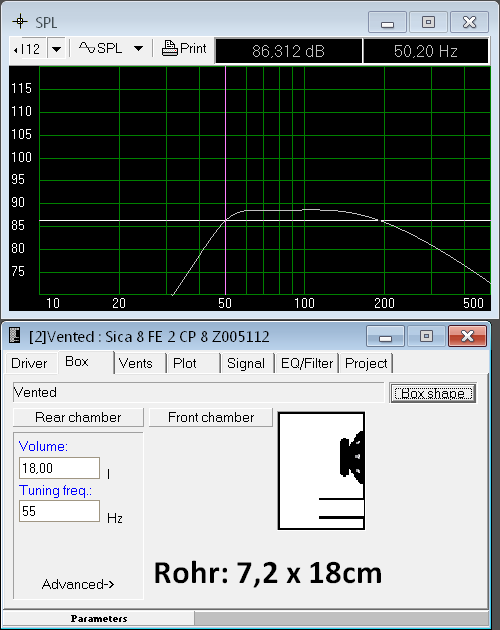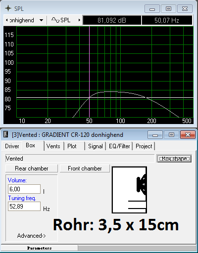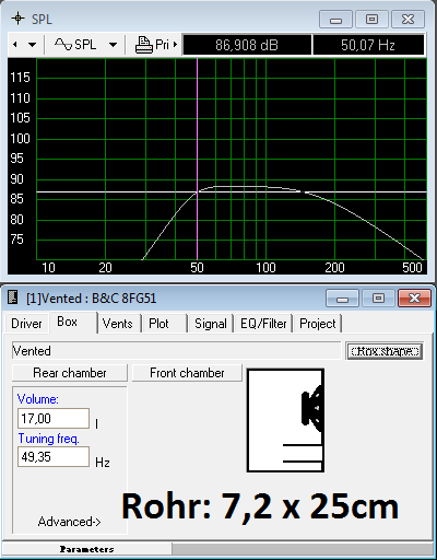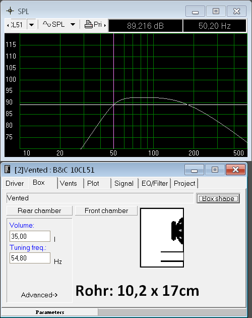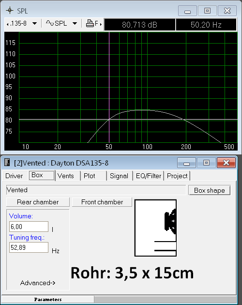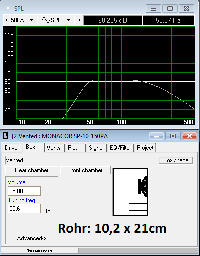35L @ 55Hz | 1x 10,2 x 17 cm | 89,2 / 92,3 dB | 50Hz | 8Ω | €€€ | Sehr laut mit noch ausreichend viel Tiefgang |