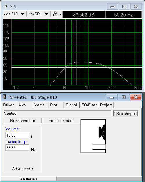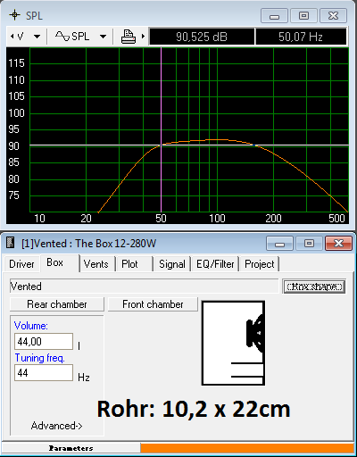 Am Beispiel des the box speaker 12-280/8-W würde ich das endgültige Gehäuse innen etwa 50L groß machen.