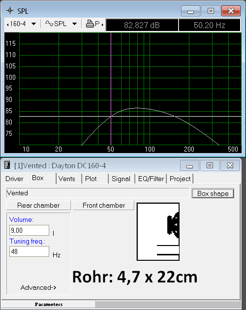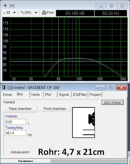 9L @ 49Hz | 1x 4,7 x 21 cm | 83,2 / 85,5 dB | 47Hz | 8Ω | € | Relativ viel Tiefgang und nicht all zu teuer. |