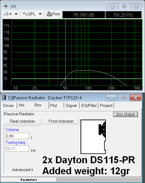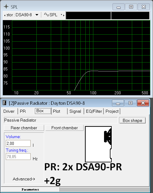 2,8L @ 59Hz | 2x DS115-PR | 75,4 / 81,5 dB | 55Hz | 4Ω | € | ★ Recht leise aber auch unfassbar kompakt! 12gr Zusatzmasse!  |