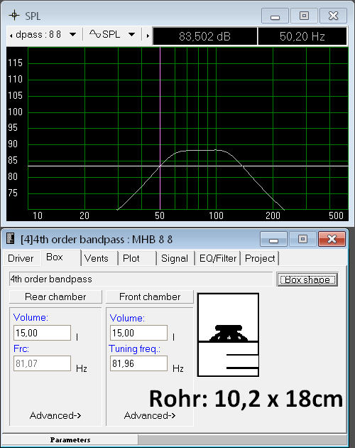 | MHB 8 | 30L BP4th | 1x 10,2 x 18 cm | 83,5 / 88,2 dB | 52Hz | 8Ω | € | Front: 15L Rück: 15L @ 82Hz  |
