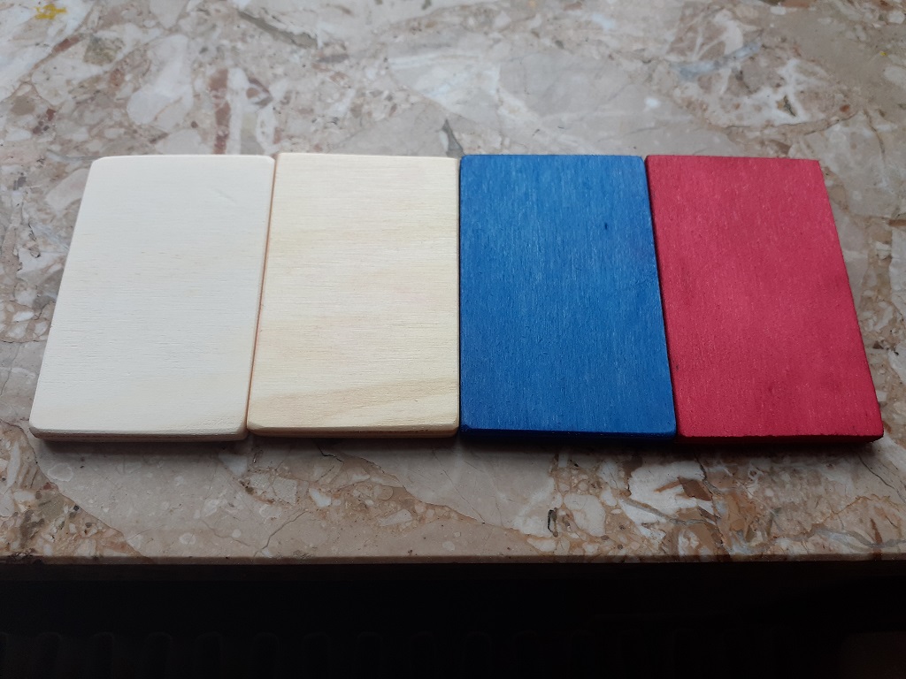 V.l.n.r.: natur, 1x geölt, 1x Beize rot, 1x Beize blau