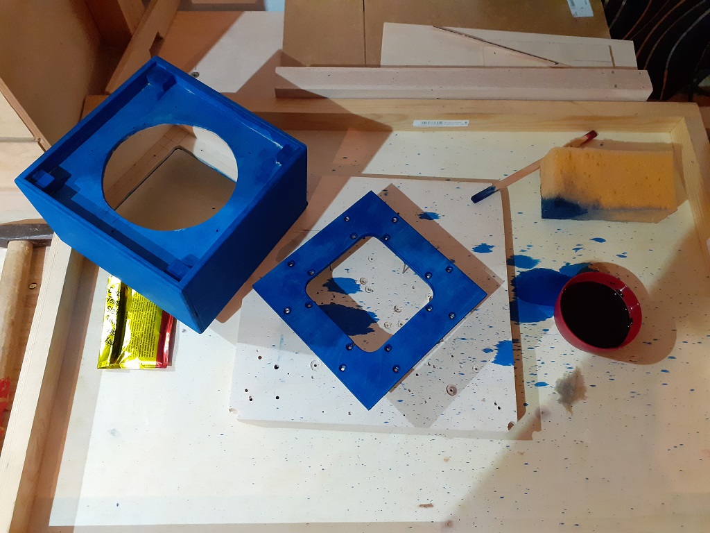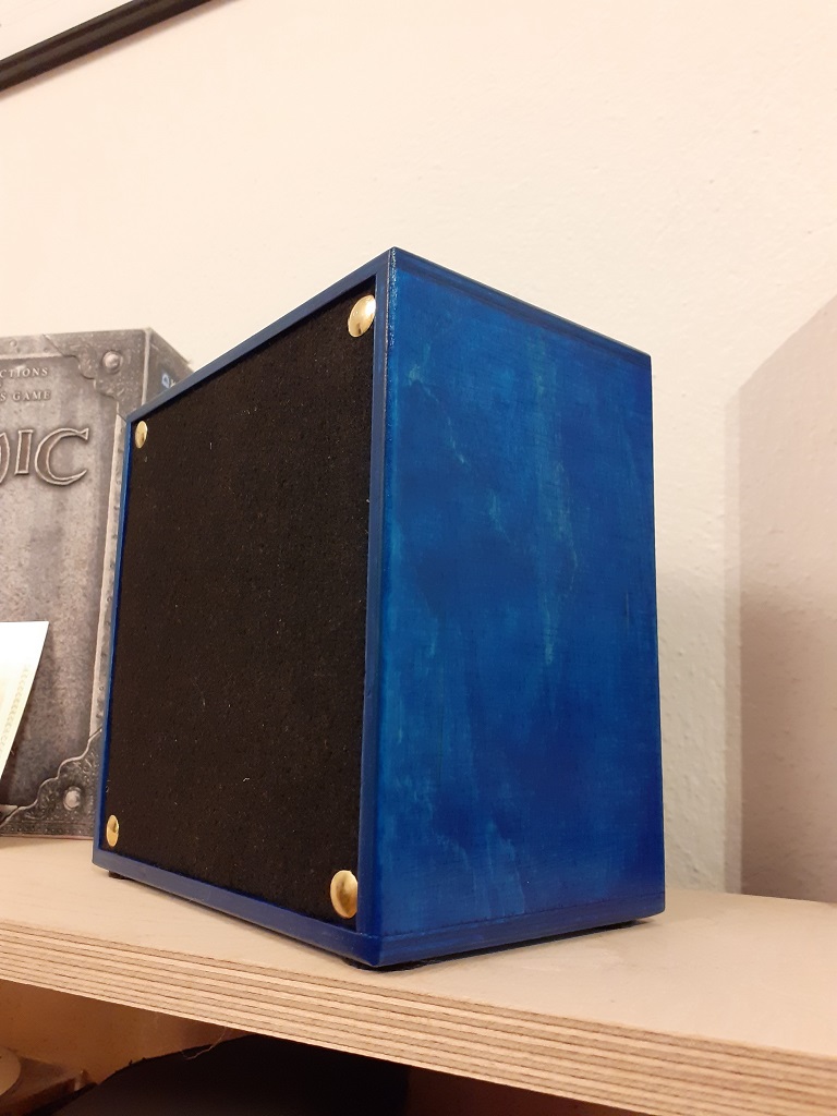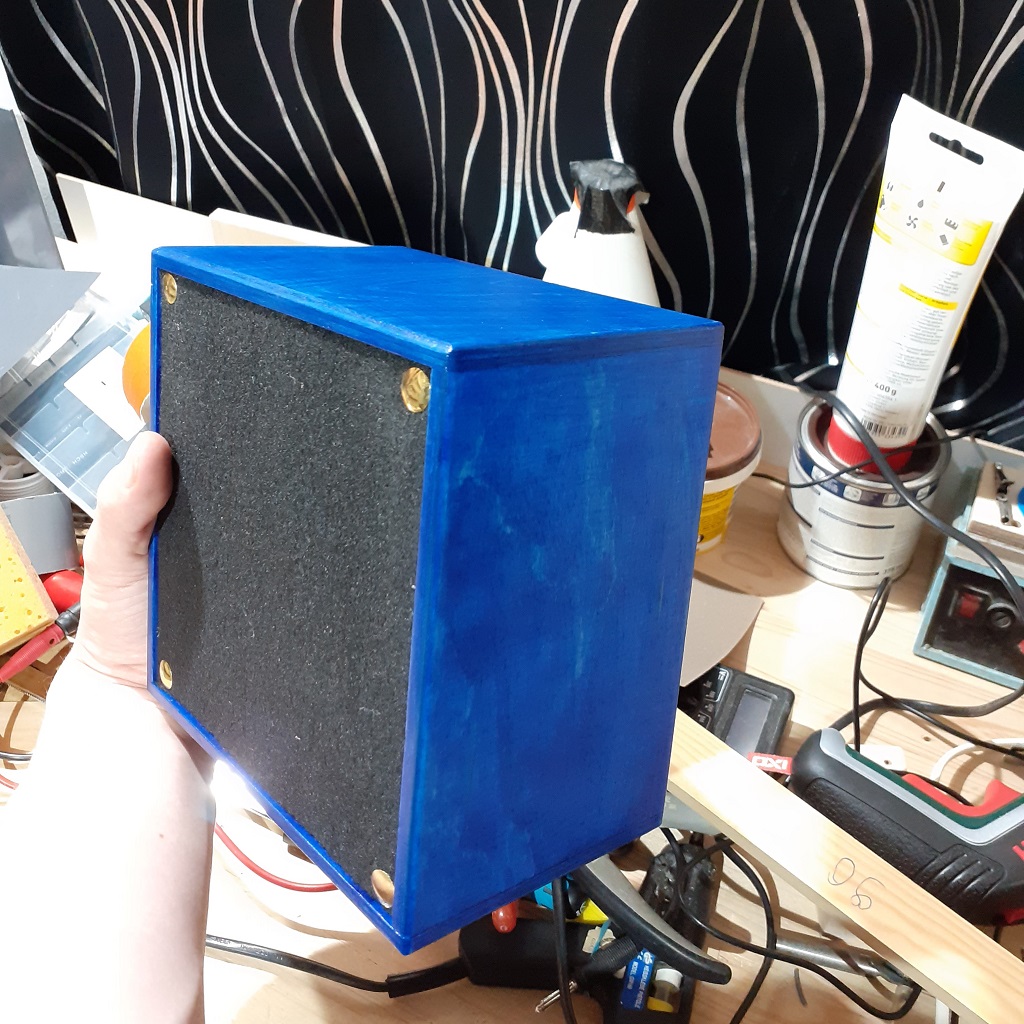 Das Gehäuse wurde aus 6,5mm starkem Multiplex gebaut und hat Abmessungen von 16,3 x 16,3 x 10 Zentimetern.