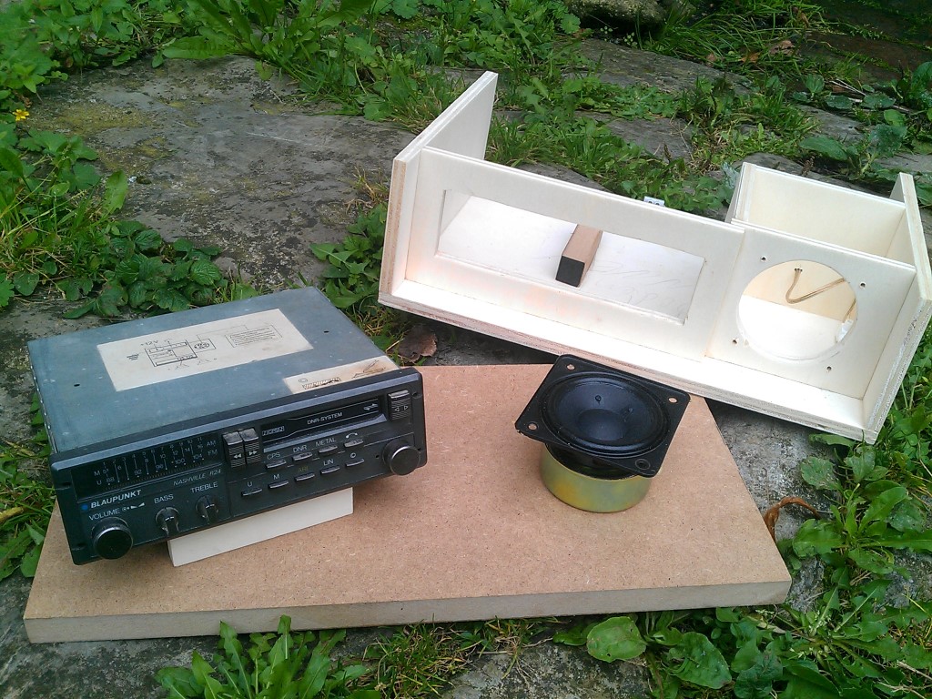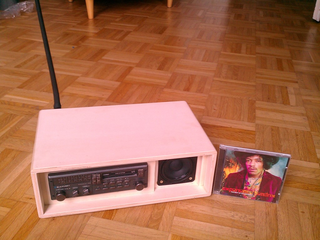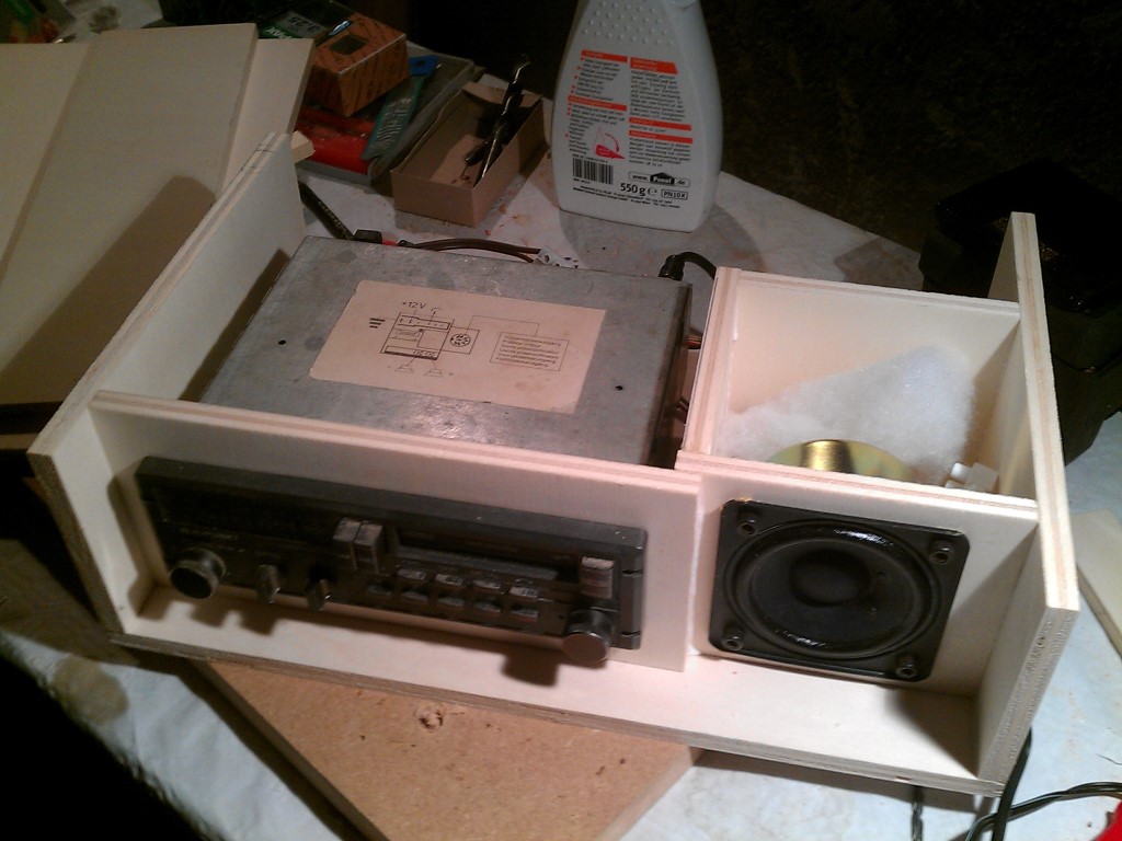Ein Küchenradio aus 10mm Pappel Sperrholz. Bestückt ist es mit einem Blaupunkt Nashville R24 Autoradio und einem 8cm Breitbandlautsprecher, ausgeschlachtet aus einem Creative 5.1 PC-System.